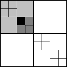 ассмотрим еще один пример. Пусть требуется написать подпрограмму для изображения серии вложенных окружностей. Окружность диаметра d содержит внутри себя 4 одинаковых окружности диаметра d/2, которые касаются ее в верхней, нижней, правой и левой точках. С свою очередь каждая из четырех внутренних окружностей также содержит внутри еще по 4 окружности меньшего диаметра и так далее.Аналогично предыдущей задаче, любая из внутренних окружностей есть полное подобие внешней. Окончание рекурсивных вызовов будет задаваться условием d<=1 (на каком-то уровне упрощения окружность превратилась в точку).