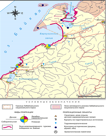 2. По параметрам и факторам природных, социально-экономических и эколого-географических условий, с учетом мировых тенденции туриндустрии, можно уверенно констатировать, что восточное побережье оз. Байкал представляет собой наиболее привлекательный полигон для реализации новейших идей в области организации туристско-рекреационной системы регионального уровня. Здесь существуют весьма благоприятные условия для организации различных видов туризма – экологического, спортивно-оздоровительного, сельского, научно-познавательного и делового. Достаточно активно используются в летний период пляжные зоны на берегах Баргузинского и Чивыркуйского заливов Байкала туристами со стороны Иркутской области. Эти зоны требуют обустройства с доведением их до стандартов мирового уровня.