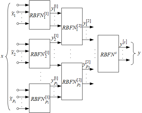 ). Процес нарощування архітектури HRBFN продовжується до тих пір, поки в вихідному s-му шарі не залишиться одна RBFN, вихід якої