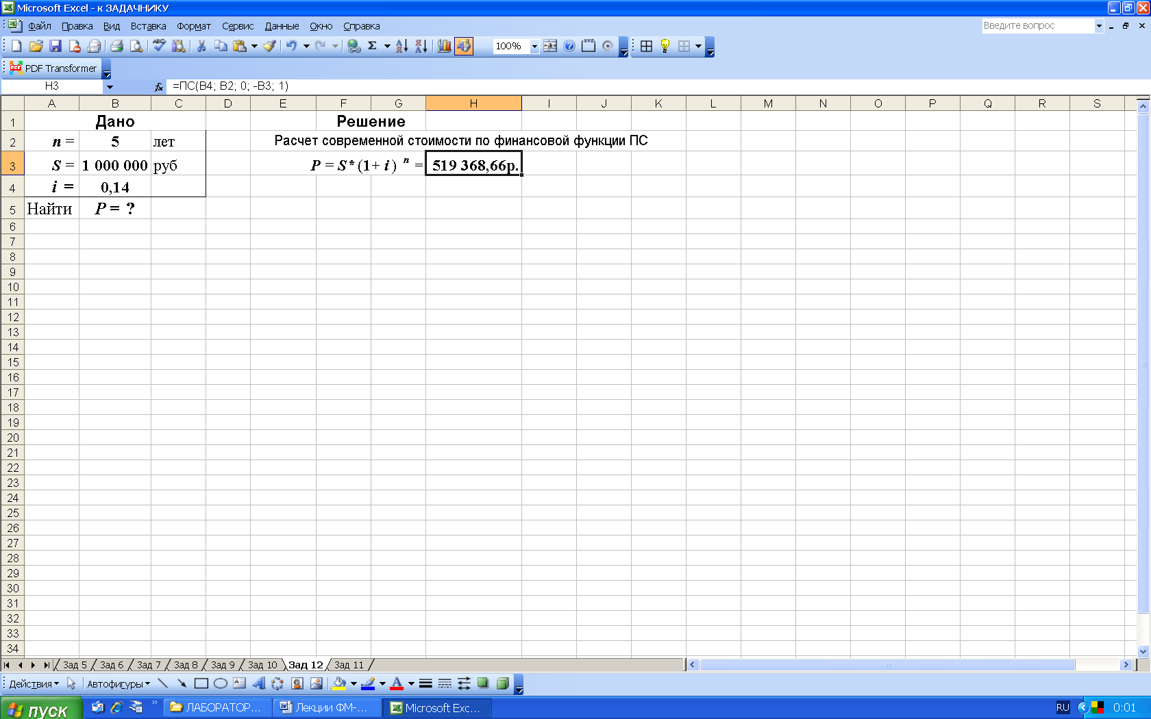 P = S/(1 + i ) n =1 000 000/(1+0,14) 5 = 519 368,66 руб.