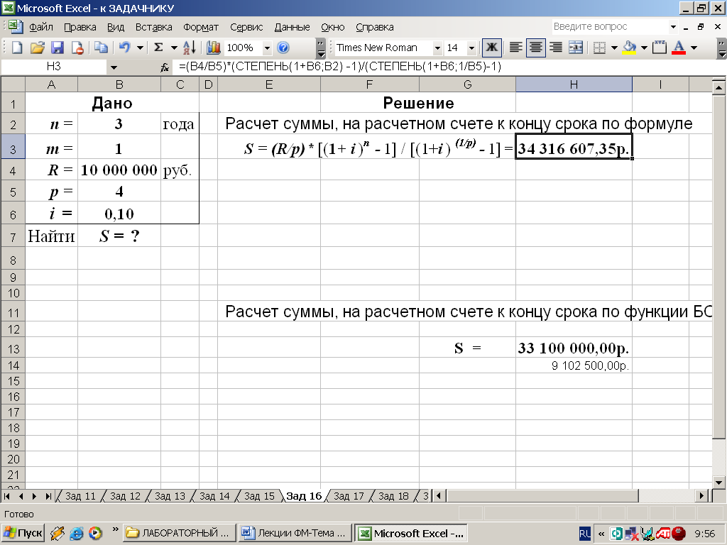 Рис. 52. Результаты расчета в Excel (в ячейку H4 введена формула: =(B4/B5)*((1-СТЕПЕНЬ(1+B6/B3;-B2*B3))/(СТЕПЕНЬ(1+B6/B3;B3/B5)-1)) )