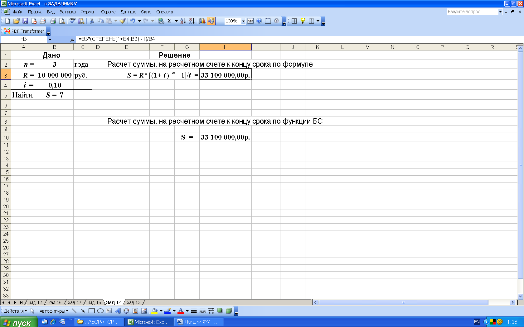 Рис. 28. Результаты расчета в Excel (в ячейку H3 введена формула: =B4*(СТЕПЕНЬ(1+B5/B3;B3*B2) -1)/(СТЕПЕНЬ(1+B5/B3;B3)-1) )