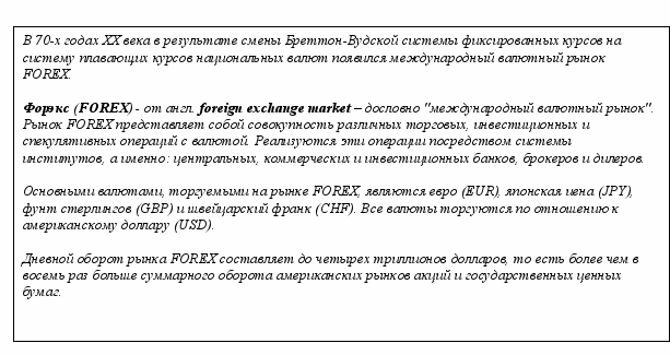 Одним из видов биржевой игры является рынок ФОРЭКС. Данный рынок основан на игре на курсах валют. В отличие от биржевой игры на рынке акций (фондовом рынке), рынок ФОРЭКС является более доступным в Украине. Для участия на данном рынке достаточно иметь сумму, которая будет вложена в биржевую игру и выход в сеть интернет для непосредственного осуществления операций с валютами. В отношении рынка ФОРЭКС в настоящее время имеется достаточное количество литературы.