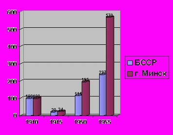 Уровень 1945 г. в 1950 г. был превышен в 5,8 раза. Продукция машиностроения в 1950 г. в 8,9 раза превысила уровень 1945 г. и в 3,4 раза - 1940 г. Машиностроение стало ведущей отраслью белорусской промышленности. В 1955 г., когда в число действующих вступили все восстановленные и вновь построенные предприятия, уровень 1945 г. в промышленности Беларуси был превышен почти в 12 раз, а уровень 1940 г. - в 2,4 раза. Еще более динамично развивалась промышленность в столице Беларуси, где в 1950 г. промышленное производство по сравнению с довоенным почти удвоилось, а в 1955 г. довоенный уровень был превышен в 5,7 раза, уровень 1945 г. - почти в 24 раза. Таких темпов развития промышленность Беларуси не знала ни раньше, ни в последующем. Однако это прежде всего касалось тяжелой индустрии. Легкая и пищевая промышленность в 1950 г. не достигла объемов выпуска продукции 1940 г. Сельское хозяйство превзошло довоенный уровень производства только в середине 1950-х гг. Отставало от развития индустрии и материальное благосостояние населения.