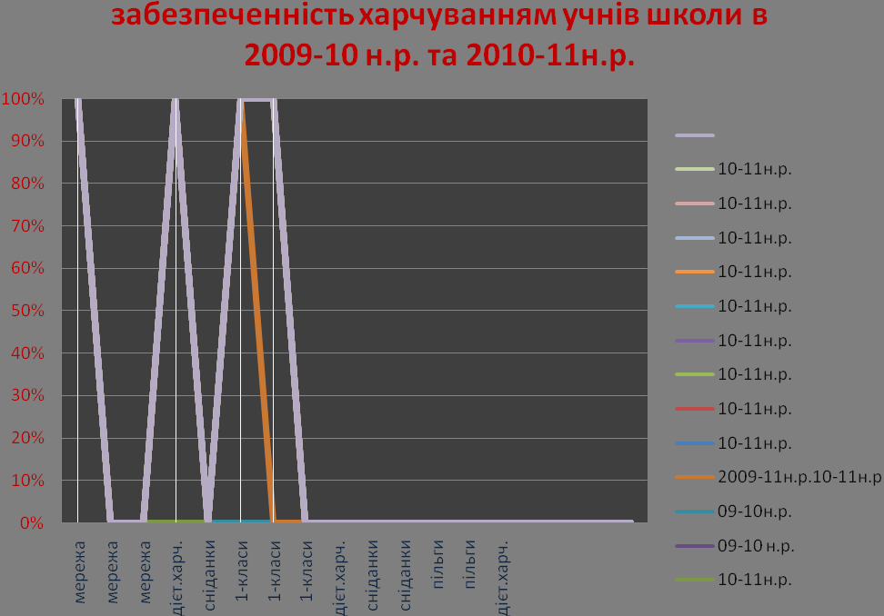 | Навчаль-ний рік | мережа | Кількість учнів, забезпечених сніданками | Кількість учнів, забезпечених обідами (за кошти батьків) | Кількість учнів пільг.категорій, забезпечених безкоштовним харчуванням | Кількість учнів, забезпечених дієтичним харчуванням | Кількість учнів 1-х кл., забезпечених безкоштовним молоком |