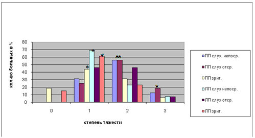 Проведенное нейропсихологическое обследование выявило модально-неспецифические нарушения памяти: у 93,3% больных слухоречевой и у 66,7% - зрительной памяти. Преобладали легкие и средние степени нарушения памяти, при этом в основном страдала непосредственная слухо-речевая память (у 79,4% больных), в то время как при тяжелых нарушениях памяти страдало в больше степени отсроченное воспроизведение (у 21,6% больных) (рис. 10).