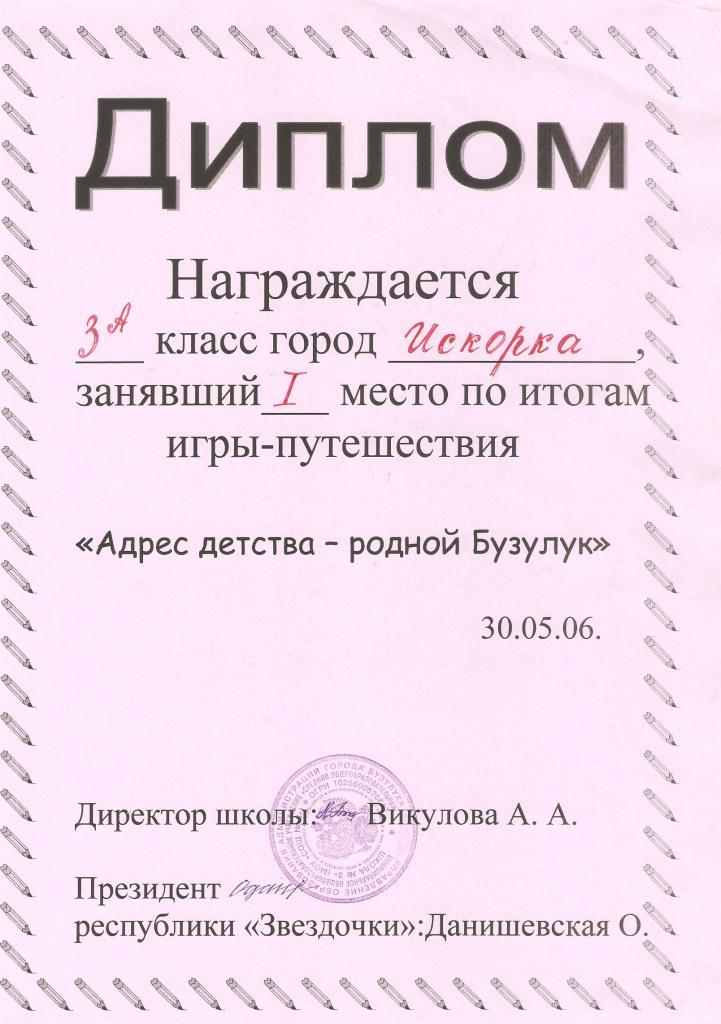 | Поисковая работа | Саблин Ю. | 3 А | История города Бузулука | Март 2006 | + | | |