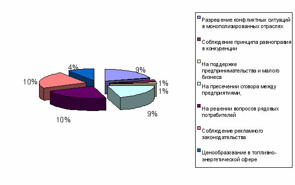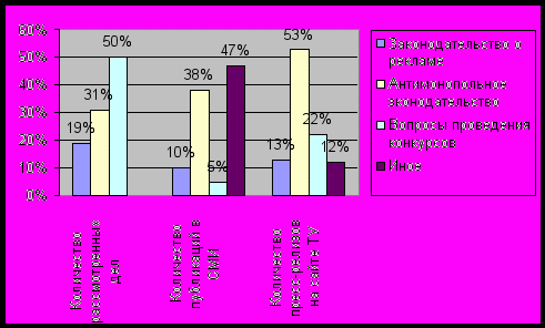 Как видно, наибольшее количество дел было рассмотрено по вопросам проведения аукционов и конкурсов по размещению государственных заказов, хотя это направление деятельности затрагивает интересы небольшой части предпринимателей. С другой стороны, в то время как нарушения законодательства о рекламе и антимонопольного законодательства касаются значительной части людей, включая широкую общественность, количество дел по ним было гораздо меньше в сравнении с первым направлением. Возможно, это объясняется тем, что конкурсы - прерогатива профессиональных участников рынка, остальное население о деятельности УФАС информировано хуже, оно не осведомлено о своих правах и возможностях их защиты.