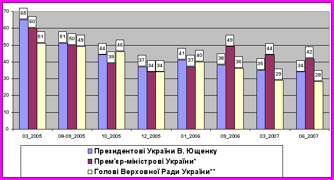 * Березень--вересень 2005 р. – вимірювався рівень довіри до Ю. Тимошенко;жовтень--січень 2006 р. – вимірювався рівень довіри до Ю. Єханурова;