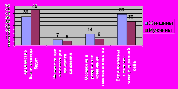 Несмотря на существенные изменения, произошедшие за последние десятилетия, женщина по-прежнему отдает право решать свою судьбу в вопросе неравенства сильной половине человечества – мужчинам, подтверждая тем самым господствующее положение мужчин в современном обществе. Так 39% женщин считают, что неравенство будет преодолено, если сами мужчины признают женщину равной себе, также за собой признают это право 30% мужчин. Для 36% женщин и 45% мужчин вопрос неравенства остается не решаемым, по их мнению, неравенство было и будет всегда. И лишь 14% женщин и 8% мужчин надеются решить этот вопрос с помощью изменений в законодательстве (диаграмма 4).