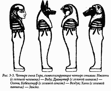 имя — это была группа божественных крестных, появлявшихся при рождении людей, коим была суждена слава; здесь и четыре сына Гора, представлявшие четыре Стихии (см. рис. 3-3).