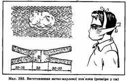 атно-марлева пов'язка (мал. 293) виготовляється із шматка марлі розміром 100x50 см. Його розстеляють на столі, посередині на площі 30x20 см кладуть шар вати завтовшки 1—2 см (якщо немає вати, то її замінюють марлею в 5—6 шарів). Вільний край марлі по довжині загинають з обох боків на вату, а на кінцях роблять розрізи (30—35 см).П