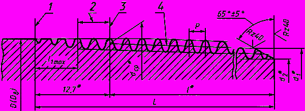 1 - конец сбега резьбы; 2 - нитки со срезанными вершинами; 3 - основная плоскость;
