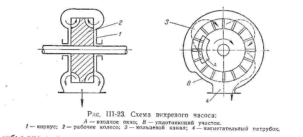 В этих насосах для передачи энергии от рабочего колеса к жидкости и создания напора используется энергия вихревого движения жидкости. Создаваемый напор частично обеспечивается центробежными силами, но большая его часть определяется энергией вихрей, образующихся в жидкости при вращении рабочего колеса. Жидкость поступает через окно А к основаниям лопастей, отбрасывается центробежной силой в кольцевой какал, в котором приобретает вихревое движение, и перемещается вдоль канала к выходному патрубку. На этом пути жидкость неоднократно попадает в пространство между лопастями, где ей дополнительно сообщается механическая энергия. В результате многократного контакта между перекачиваемой жидкостью и рабочим колесом достигаются более высокие напоры, чем у центробежных насосов.