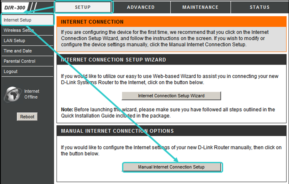 После выполнения авторизации появится окно WEB-интерфейса устройства через которое вы можете настраивать маршрутизатор. Для настройки подключения к провайдеру выберите вкладку «Setup» нажмите слева кнопку «Internet Setup», а затем нажмите на кнопку «Manual Internet Connection Setup».