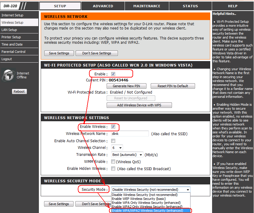 - В Security Mode выбираем Enable WPA/WPA2 Wireless Security (enhanced)