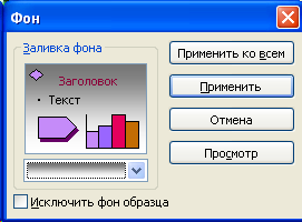 Фон слайда. Если вам не нравится ни один из вышеприведенных шаблонов, вы можете сами создать красивый фон для слайда: Формат Фон. Перед вами появится маленькое окно фона (рис. 9.), в левом нижнем поле которого вы выбираете фон слайда, то есть заливку слайда цветом, текстурой, узором или рисунком. Залить выбранным способом можно один слайд (Применить) или все сразу (Применить ко всем).