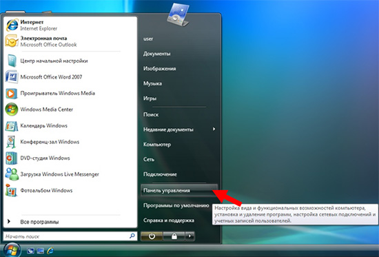 1. Выбираем в меню «Пуск» пункт «Панель управление».