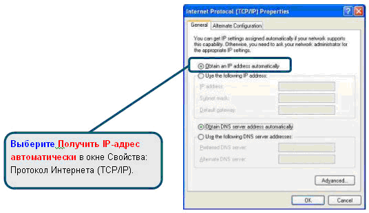Выберите опцию " Получить IP-адрес автоматически" (Obtain an IP address automatically) и "Получить DNS-адрес сервера автоматически". Нажмите кнопку OK.