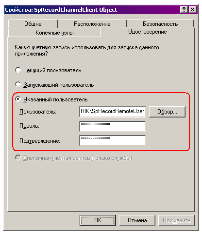 Выберите пункт Указанный пользователь и укажите имя пользователя, от имени которого будет запускаться компонент, и пароль.