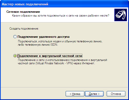 - Выбрать Подключение к виртуальной частной сети и нажать кнопку Далее: