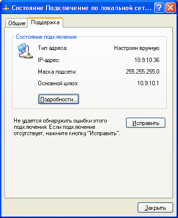 Для проверки введенных реквизитов в окне Состояние подключения откройте вкладку Поддержка, нажмите кнопку Закрыть: