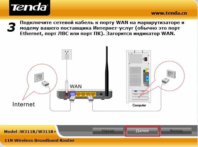 Подключаем сетевой кабель от модема в порт «WAN» на маршрутизаторе как показано на рис.10 и нажимаем кнопку «Далее».