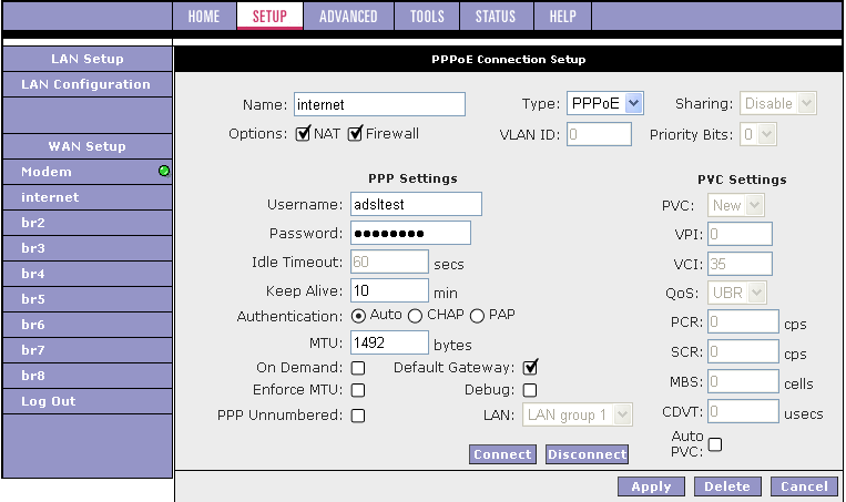 - PVC (характеристики виртуального канала соединения): VPI=0 и VCI=35;