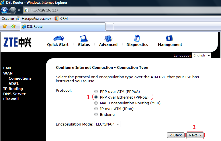 - Выбираем протокол PPP over Ethernet (PPPoE) и нажимаем кнопку Next: