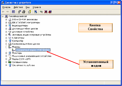 Модемы, установленные на вашем компьютере, отображаются в разделе Модемы дерева устройств. Как правило, в системе должен присутствовать один модем и его название и тип, отображаемые в Диспетчере устройств, должны соответствовать типу вашего модема. Для проверки правильности функционирования и настройки модема, выберите ваш модем и нажмите кнопку Свойства (рис. 3), доступ к свойствам модема можно получить также через контекстное меню, вызываемое нажатием правой кнопки мышки.