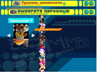 В этом окне Вы можете выбрать одного из многочисленных «мультяшных» Героев, если хотите, чтобы они танцевали вместе с Вами на экране. Танцевать с ними веселее. Двигайте стрелками ВПРАВО-ВЛЕВО Вашего коврика и выбирайте. Затем нажмите СТАРТ и переходите к следующему выбору.