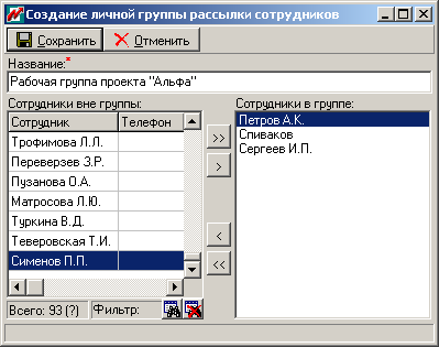 Справочник Личные группы рассылки сотрудников служит для создания и настройки состава личных групп рассылки (Рис. 20).