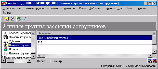 Рис. 26 – Окно, показывающее справочник "Личные группы рассылки подразделений" и команды меню для работы с этим справочником