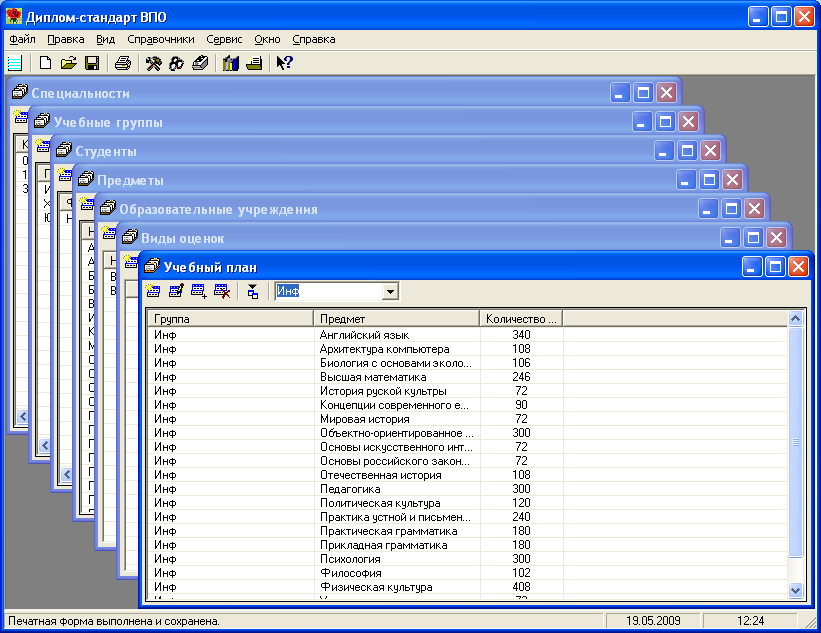Программа «Диплом-стандарт» ВПО позволяет полностью автоматизировать процесс печати документов по выпуску специалистов, бакалавров, магистров высшего профессионального образования: вкладыша к диплому, приложения, академической справки (документы образца 2003 года). Программа будет полезна в работе секретарей учебных отделов ВУЗов, позволит ускорить процесс подготовки документов.