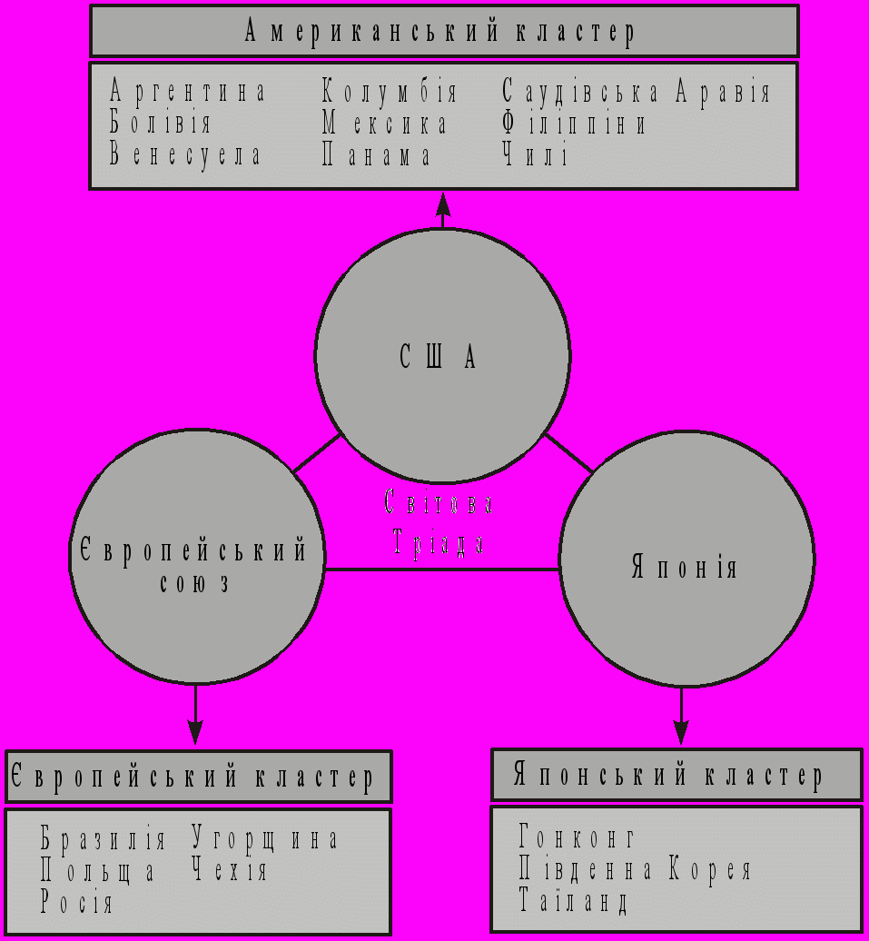 Як видно з цієї схеми, кожен із центрів світової економічної тріади утворює навколо себе певну групу країн (кластер), якій притаманно чимало загальних рис не лише щодо фінансових потоків, а й управлінської діяльності.