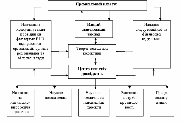 Рис. 2. Принципова схема функціонування центру новітніх досліджень на базі ВНЗ у рамках кластера