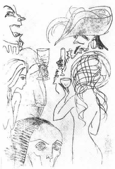 Степан Лиходеев – безответственный, бездуховный человек, предпочитающий видеть мир сквозь стекло бутылки с водкой. А грехов у него целый воз: «… вообще они, - докладывает Коровьев, говоря о Степе во множественном числе, - в последнее время жутко свинячат. Пьянствуют, вступают в связи с женщинами, используя свое положение, ни черта не делают, да и делать ни черта не могут, потому что ничего не смыслят в том, что им поручено. Начальству втирают очки». Автор, описывая его внешность, создаёт образ растрёпанного жизнью человека: «Степа разлепил склеенные веки и увидел, что отражается в трюмо в виде человека с торчащими в разные стороны волосами, с опухшей, покрытой черной щетиною физиономией, с заплывшими глазами, в грязной сорочке с воротником и галстуком…». [1,60] Нарисовав фантасмагорический образ Степы, я представила его в виде бутылки водки, получеловека, потерявшего человеческий облик. (П. № 3, И. № 8 ).