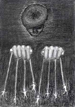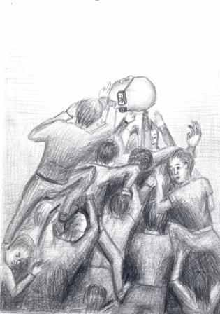 В правление МАССОЛИТА входят 12 человек, а возглавляет его Михаил Александрович Берлиоз. Самая печальная участь достается ему. Беда Берлиоза в том же самом: он человек без фантазии. Но с него за это особый спрос, ведь это руководитель писательской организации – и при этом неисправимый догматик, признающий лишь отштампованные истины. Поднимая отрезанную голову Берлиоза на Великом Балу, Воланд обращается к ней: «Каждому будет дано по его вере…». Булгаков высмеивает Берлиоза за его стремление изобрести «обыкновенные объяснения» для «явлений необыкновенных». Писатель прибегает к иронической буффонаде, высмеивая тщету, как ему кажется, подобных попыток. Я изобразила Берлиоза в виде падающей главы огромной пирамиды из человеческих тел. Каждый стремится взобраться повыше, буквально «шагая по головам». (П. № 3, И. № 6 )