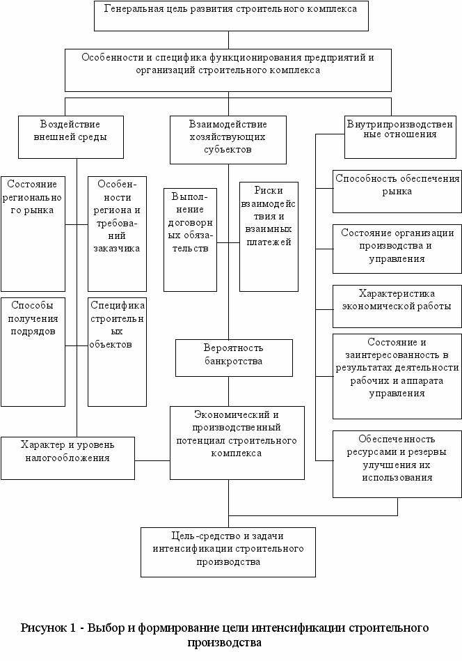 Анализ основных направлений интенсификации строительного производства позволил выделить основные факторы внешнего воздействия, определяющие приоритеты и цели структурных преобразований в строительном комплексе. Прежде всего, это факторы макроэкономической среды, которые в основном определяются инновационно - инвестиционной политикой государства. Для интенсификации строительного производства наибольшее значение имеют факторы внутрифирменного характера, к которым, прежде всего, относятся функциональные факторы изменения задач и характера управленческой деятельности предприятия. Это связано с появлением новых видов управленческой деятельности: стратегическое планирование, анализ рыночных цен, ёмкости и насыщения рынка, конкурентов; финансовое управление; анализ структуры и динамика издержек и т.д. Выбор и формирование цели интенсификации строительного производства показаны на рис.1.