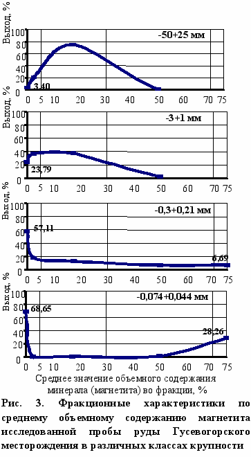 Отмечено, что свободные зерна преобладающей фазы наблюдаются уже в крупных классах (-50+25 мм). Кроме того, в этих классах содержится значительная доля бедных сростков, следовательно, эти классы могут быть подвергнуты предварительному обогащению с целью удаления большей части руды, непригодной к дальнейшему обогащению. В крупных классах доля средних сростков (5-30 %) составляет порядка 70 %. Общая тенденция перераспределения сростков такова: в классах крупностью более 0,3 мм с уменьшением крупности наблюдается приращение доли преобладающей фазы, а в классах крупностью менее 0,3 мм происходит приращение доли подчиненной фазы. Начиная с класса -0,3+0,21 мм возможно обогащение с целью получения небольшого количества концентрата. Полное раскрытие происходит в классе крупности менее 0,044 мм. Общая доля сростков в классе -0,074+0,044 мм составляет порядка 3 %, а доля раскрытых зерен магнетита – порядка 28 %.