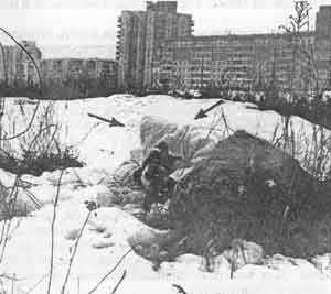 В городе камуфляж должен быть тоже "лохматый", только другого цвета Как уже упоминалось, камуфляж должен быть таким, чтобы в его сторону не хотелось смотреть, - это основной психологический принцип камуфляжа. На кого в городе не хочется смотреть? Конечно, на грязных и оборванных бомжей. Поэтому городской камуфляж изготовляется серого цвета (сухой асфальт - этот цвет преобладает в городе) и обшивается любыми серо-черными лоскутами и полосками. Кроме того, снаружи камуфляж в меру вымазывается известкой, сажей, кирпичной пылью, короче, делается так, чтобы взгляду не хотелось останавливаться на нем. Места для снайперских засад в городе выбираются так, чтобы на них тоже не хотелось смотреть. Обычно это кучи мусора, свалки, строительные обломки, которые в наше время встречаются повсюду (фото 182).