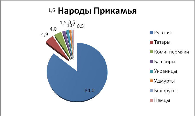 На территории Прикамья проживает более 80 национальностей. Преобладают русские. Наиболее многочисленные среди других национальностей- татары, коми- пермяки, башкиры, украинцы, белорусы и немцы.
