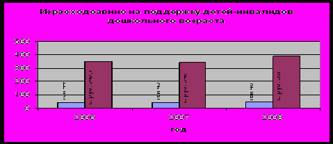 На социальную поддержку 46 детей – инвалидов дошкольного возраста израсходовано в 2007 году 387,0 тыс. руб., исходя из размера выплаты родителям в сумме 701 рубль в месяц.
