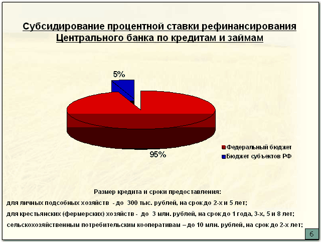 Впервые предполагается осуществить 100% субсидирование процентной ставки рефинансирования Центрального банка по привлекаемым кредитам – 95% ставки субсидируется из федерального бюджета и 5% ставки – из бюджета субъекта Российской Федерации, в котором расположено хозяйство.