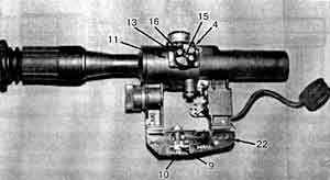 Прицел ПСО-1 очень легко и просто снимается с винтовки и присоединяется к ней без снижения качества стрельбы. Для отсоединения прицепа необходимо подать на себя ручку зажимного винта (8 на фото 96) и снять прицел с "ласточкина хвоста" в сторону приклада. "Ласточкин хвост" - посадочное место прицела - выполняется на ствольной коробке винтовки СВД очень точно, и поэтому прицел ПСО-1 не требует выведения центра зрительного поля на цель. Иногда при пристрелке прицела необходима незначительная корректировка перемещением прицельной сетки, но, как правило, прицельный угольник при этом практически не выходит из центральной области зрительного поля.