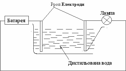 У посуд з дистильованою водою опущено електроди, під'єднані до ланцюга, у який послідовно увімкнена лампа (рис. 3.1). Лампа не горить, тому що дистильована вода не пропускає електричний струм, який іде від батареї. Але достатньо кинути у воду маленьку пучку хлористого калію, як лампа негайно спалахне. Звідси можна зробити висновок, що ланцюгом пішов струм. Це стало можливим тільки тому, що розчинення хлористого калію у дистильованій воді зробило її провідником електричного струму.