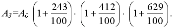 Пусть величина А в конце 1-го этапа испытывает изменение на р1%, а в конце 2 –го этапа -на р2% и т.д. Если рk > 0, то величина А возрастает; ели рk < 0, то А - убывает. Тогда в конце n- го этапа значение величины А, первоначальное значение которой равнялось А0, будет определяться формулой: