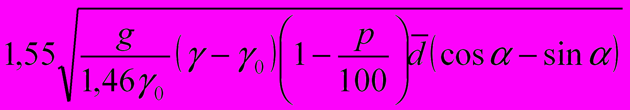 , (5.2)де γ’ – щільність ґрунту, т/м3; w –середня частота коливань швидкостей, сек-1 (при відсутності результатів спеціальних досліджень її величина дорівнює 10 сек-1); d – середній діаметр відриваємих ґрунтових окремостей, м; J – середня інтенсивність опадів, м/сек; T – коефіцієнт стоку (для злив); i – ухил поверхні (tgα); m1 = коефіцієнт, що враховує відхилення рідинного стоку на схилі; n0 – коефіцієнт шорсткості, який визначається за формулою: