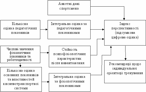 Система тестів включає чотири блоки показників: педагогічний (характер попередньої підготовки, темпи зростання спортивної майстерності, рівень розвитку спеціальних фізичних якостей, характерних для виду спорту), морфологічний, фізіологічний і психофізіологічний, для кожного з яких розраховується інтегральна оцінка. За результатами проведених обстежень, з урахуванням статі, віку та виду спорту, розроблені шкали, які дозволяють перевести зареєстровані у кожного спортсмена показники в загальну систему балів. Такий підхід дає можливість виявити переваги і недоліки спортсмена в окремих зареєстрованих показниках, і розрахувати оцінки в балах щодо кожного з блоків показників окремо, а потім розрахувати загальну оцінку ― індекс перспективності (рис. 9).
