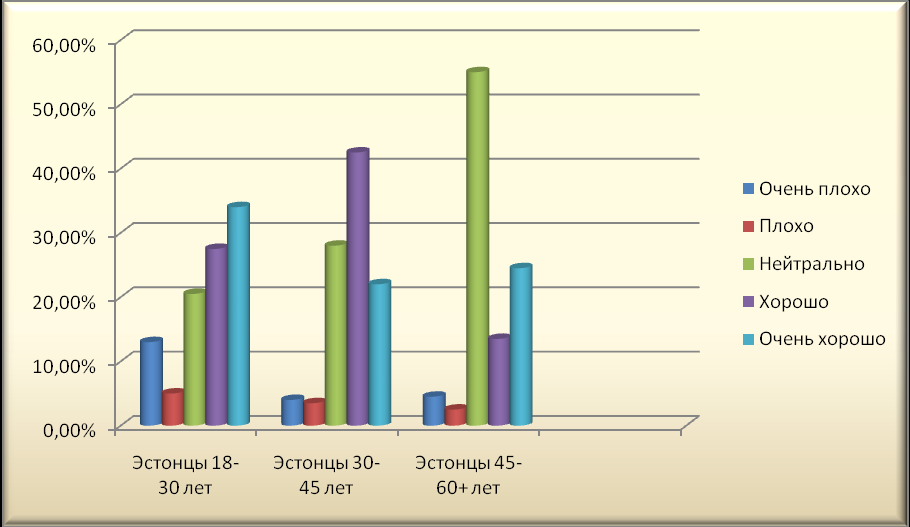 Среди наций, к которым эстонцы относятся "хорошо" и "очень хорошо" заняли первое место, естественно, сами эстонцы, на втором месте – финны, на третьем – латыши, на четвертом – литовцы, на пятом, шестом и седьмом – англичане, немцы и французы, от которых русские отстают на полпроцента, тем не менее, даже условно присоединив русских к этой европейской группе – они все равно займут пятое-восьмое места, в то время как русские "поставили" эстонцев на чистое второе место, среди наций, которым они относятся хорошо.